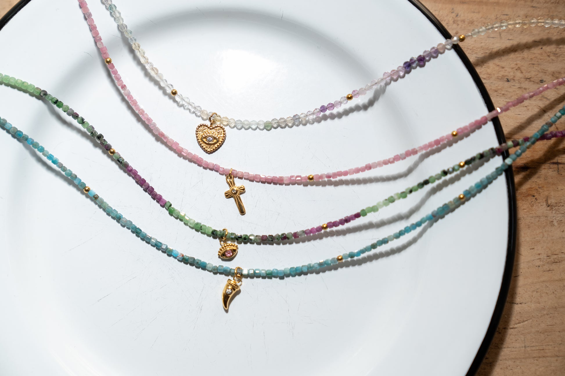 Isola beaded gemstone necklace comes in four colour ways with multiple pendant options. Create a choker stack.